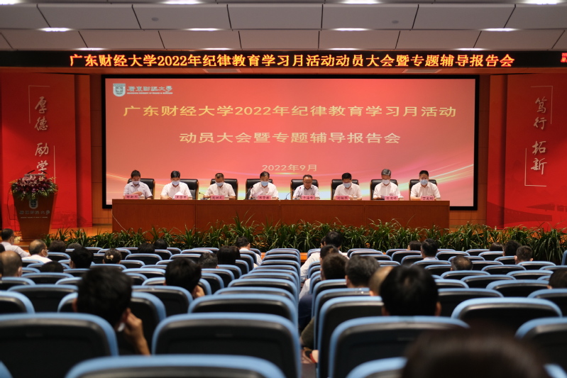 9月9日下午,学校2022年纪律教育学习月活动动员暨专题辅导报告会在广州校区正心堂召开,全体校领导、学校党委委员、纪委委员、中层干部、各二级党组织纪检委员,部分职能部门科长参加会议。会议由学校党委副书记、校长于海峰主持,党委书记郑贤操作题为《从党勇于自我革命的鲜明政治品格中汲取建设大湾区一流财经大学的不竭动力》的动员讲话和专题辅导,党委副书记、纪委书记、监察专员陈树武作题为《提高认识反躬自省做一名遵规守纪的好干部》的警示教育专题辅导。会议在佛山校区设了视频分会场。
